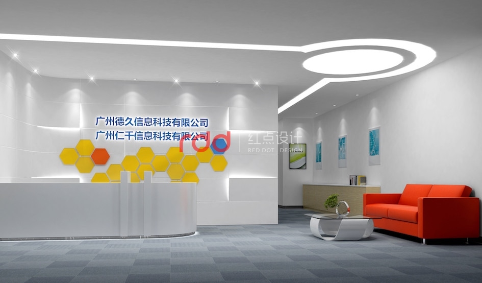 廣州德久信息科技有限公司作為信息科技行業的新興力量,紅點裝飾的設計師運用大面積的白色極簡設計,在前臺背景墻上通過簡單有效的細節設計,把背景墻的四個角設計成像即將要打開的蓋子一樣,同時運用透光效果達到穩定的結構,突出該公司的LOGO。