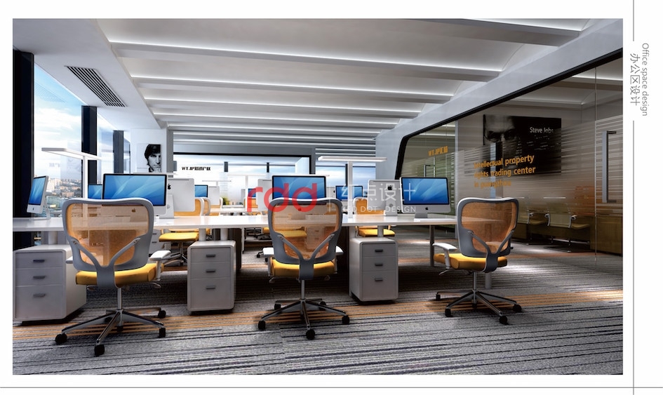開放辦公區沒有多余的裝飾,整個空間以白色為主,灰色的條文地毯,橘色的家具活躍一下空間的氣氛。