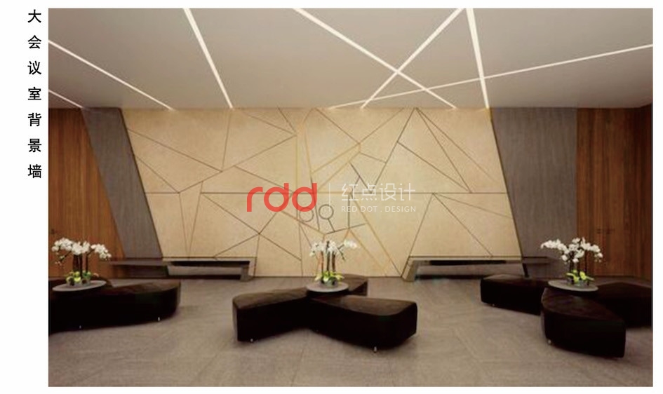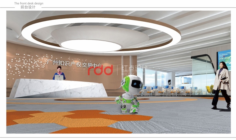 前臺是白色大理石的流線結構,背景墻由三層弧形木夾板鏤空雕花而成,雕花的三角形圖案從左下角一直延伸到右上角,正符合知識形而上學的上升過程。 地面的印花地毯與天花吊燈相互呼應。