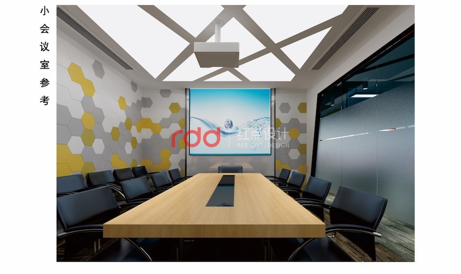會議室也是以六邊形貫穿整個空間,天花運用樹狀型結構。