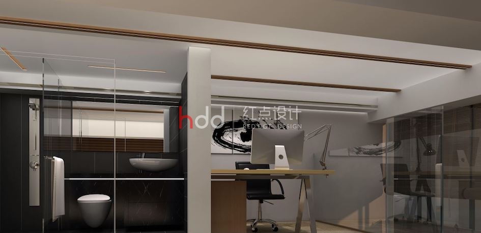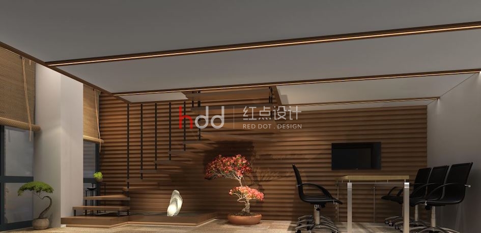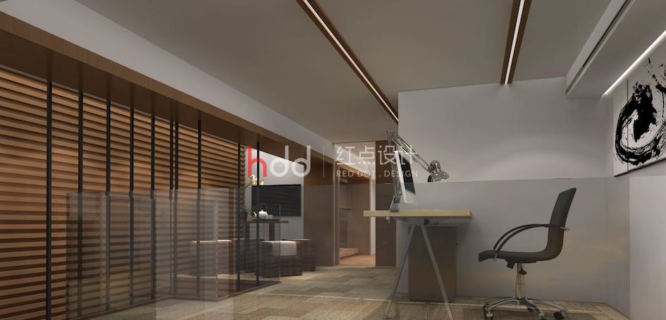 玄關處以筆墨般線條揮灑于壁面,結合水墨畫作及編織單椅,創造和風意象的端景視覺。辦公室的空間里,白色調天花板與壁面結合木紋質材的妝點,感染溫暖氣息的同時,又不失風雅氣度;天花板利用木作描繪出溝縫造型,兩側壁面則以隔柵線條鋪敘,縱橫的視覺延伸中,拉闊空間尺度;掌握梯下的畸零空間,借由植栽與藝術雕像的擺設,形塑雅致的人文意象。樓上空間規劃出浴室、主管辦公室及臥室,借由玻璃材質作為隔間,透視感的技法替整體空間營造出開放、流動氣息;延續一樓的大地用色與自然材質,利用禪風意象的端景與水墨畫作的妝點,型塑細膩的日系風范。