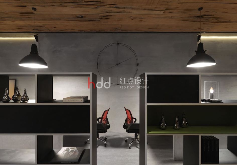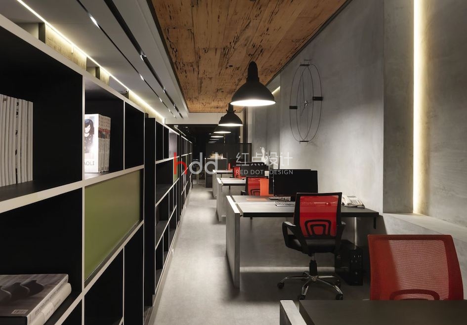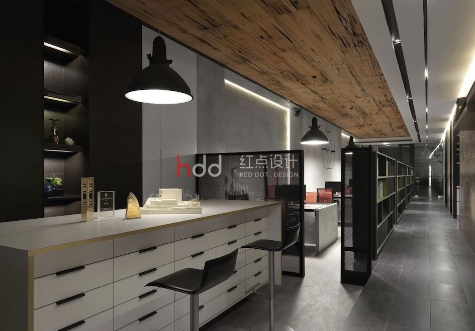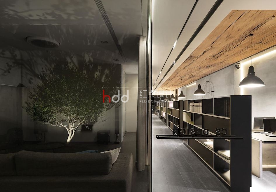 庭院外的一株單子蒲桃樹,無疑是整體一大視覺焦點,設計師加入投射燈,將樹影映照于高樓水泥墻上,展現迷人的搖曳光氛,即便是身處室內沙發區,也可借由窗戶望見搖曳扶疏的綠景與光影,締造有如畫一般的夢幻視角;辦公室空間中,則運用長型的量體延伸,導引廊道動線,搭配天花上方的極細燈帶,展現帶有工業風格的陽剛之美,同時借著開放式的柜體造型,使場域與場域之間充滿視線互動,紅色的辦公椅與綠色柜面更形成反差對比,帶出色調的活潑趣味性!辦公室內安排一座休息吧臺,位處于空間的前端,正巧可收進大門外景致,使工作同仁可在此覓得視覺與身心的放松!