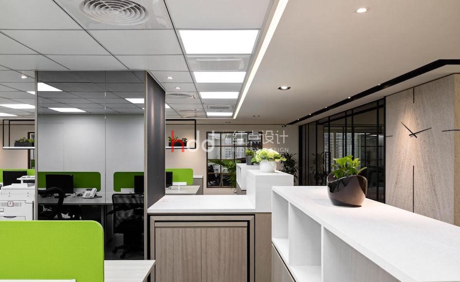 柜臺區(qū),利用懸挑量體搭配間接光源,透過塊面的合宜配置,佐以娟秀細(xì)致的公司Logo,營造有如古樸字畫般的簡約場景,并于天花架構(gòu)格柵線條,于窗旁規(guī)劃等候臥榻,增添了入門時的休憩感受;進(jìn)入開放式員工辦公領(lǐng)域,則逐漸轉(zhuǎn)以躍動氣息,運用醒目而趣味的蘋果綠色調(diào),巧妙呼應(yīng)空間內(nèi)的植栽布置,凝聚生動的工作氣氛,且給予陣列有序的座位分劃,鋪設(shè)出場域的層次之美;