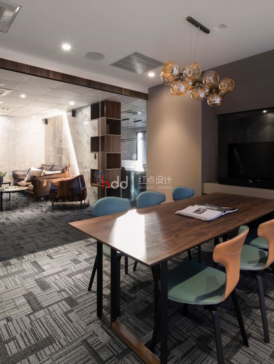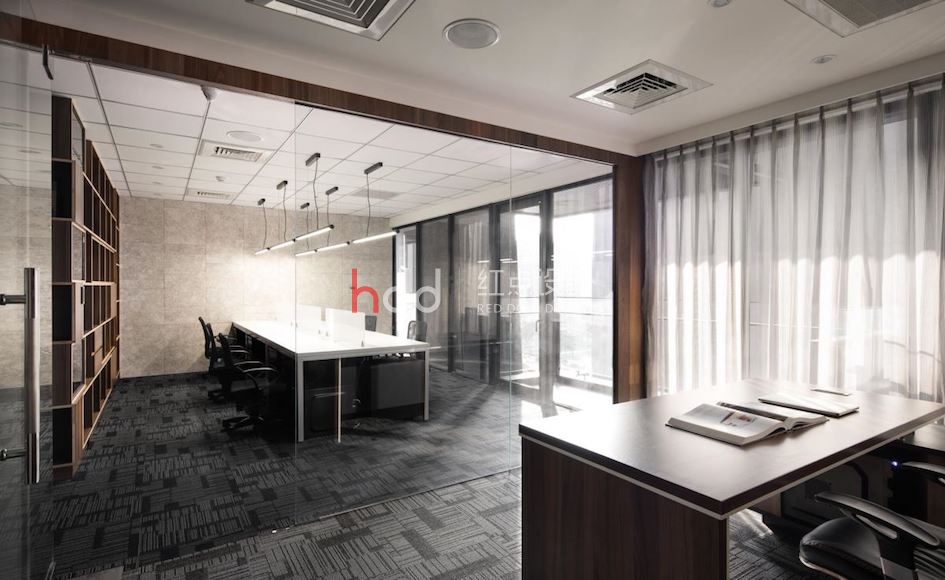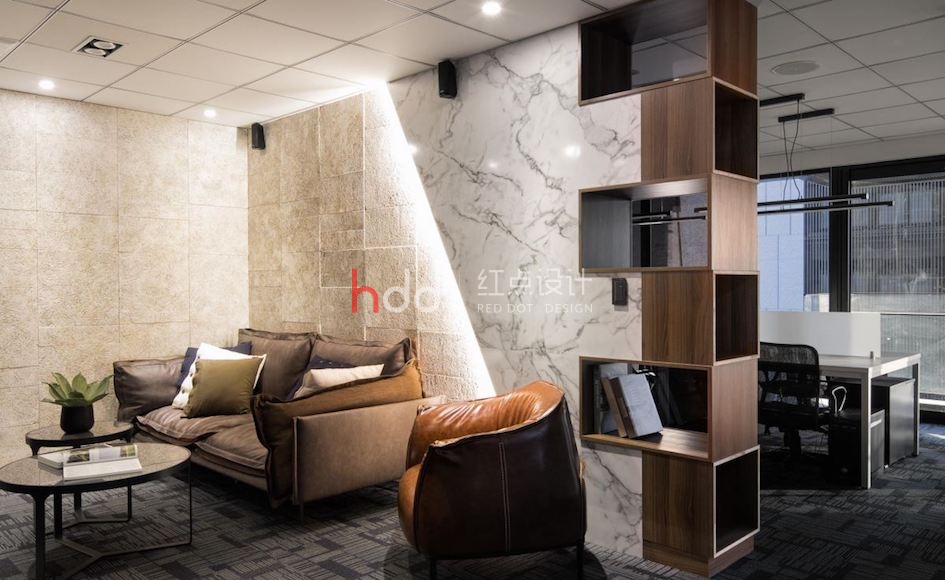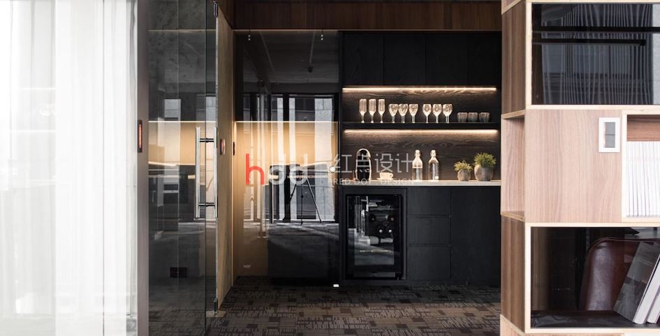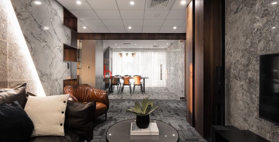 循著玄關(guān)導(dǎo)引入內(nèi),首先來到沙發(fā)接待區(qū),采以灰色天然大理石打造大器立面,加上線性間接光源照射,搭配質(zhì)感皮沙發(fā)的陳列,昭示都會時尚風(fēng)采,并讓墻體結(jié)合展示柜功能、擺上書籍或飾品,制造廊道轉(zhuǎn)角的視覺亮點;同時使用玻璃界定領(lǐng)域,讓主管辦公室、會議區(qū)等各自分屬,創(chuàng)造領(lǐng)域之間的視野連貫,并促進采光的自然流動,大會議桌旁則加入整面書墻挹注機能,以細膩做工的分割線條增添設(shè)計感,且將戶外的好風(fēng)景廣納入內(nèi),創(chuàng)造會議時的清爽氛圍! 茶水間內(nèi)有別于明亮的辦公場域,刻意以黑色面板強調(diào)俐落優(yōu)雅,并讓情境光源結(jié)合柜體設(shè)計,凝聚放松氣氛與時尚質(zhì)感!