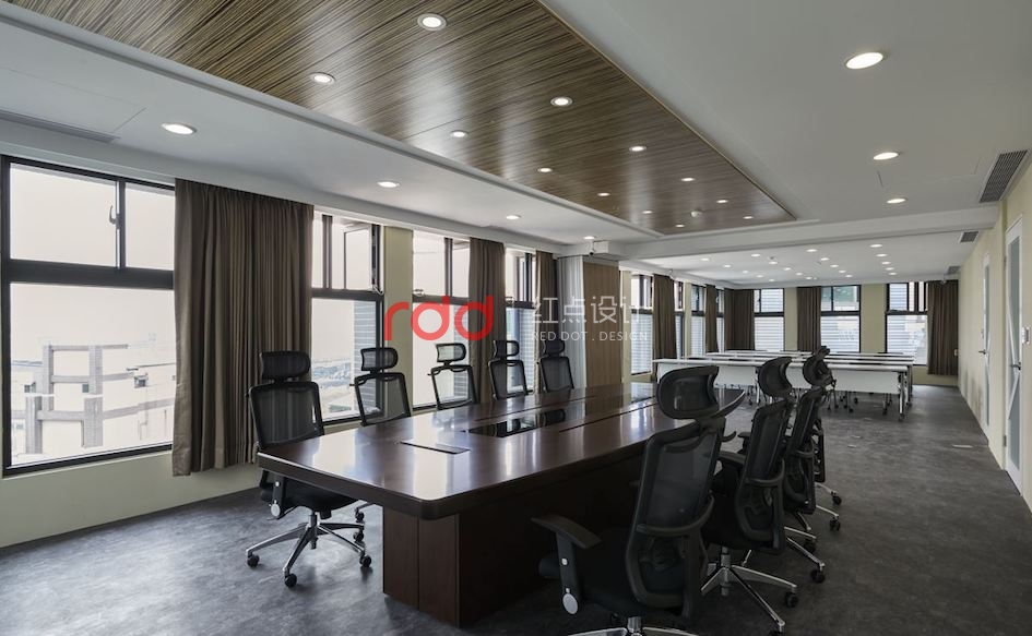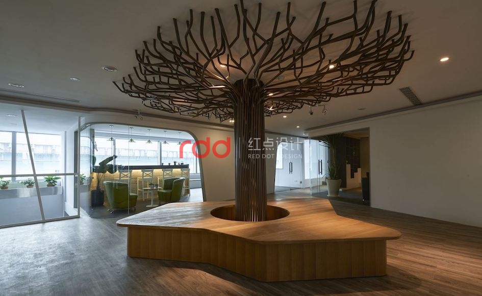 而接待洽公者的待客區(qū),從地面、墻面,一直延伸至天花板,以檜木板鋪設(shè)出像是被森林包圍的放松氛圍,另外再搭配整面玻璃墻增加場(chǎng)域穿透性,讓旁邊的辦公室也能看見(jiàn)這個(gè)療愈感滿分的美好領(lǐng)域。走上懸空樓梯,設(shè)計(jì)師在主空間設(shè)計(jì)以樹(shù)木為意象的大型藝術(shù)裝置,搭配木紋地板,將木質(zhì)感所帶來(lái)的潤(rùn)和氣息擴(kuò)散到每個(gè)角落,輸入自然人文的氣韻。
