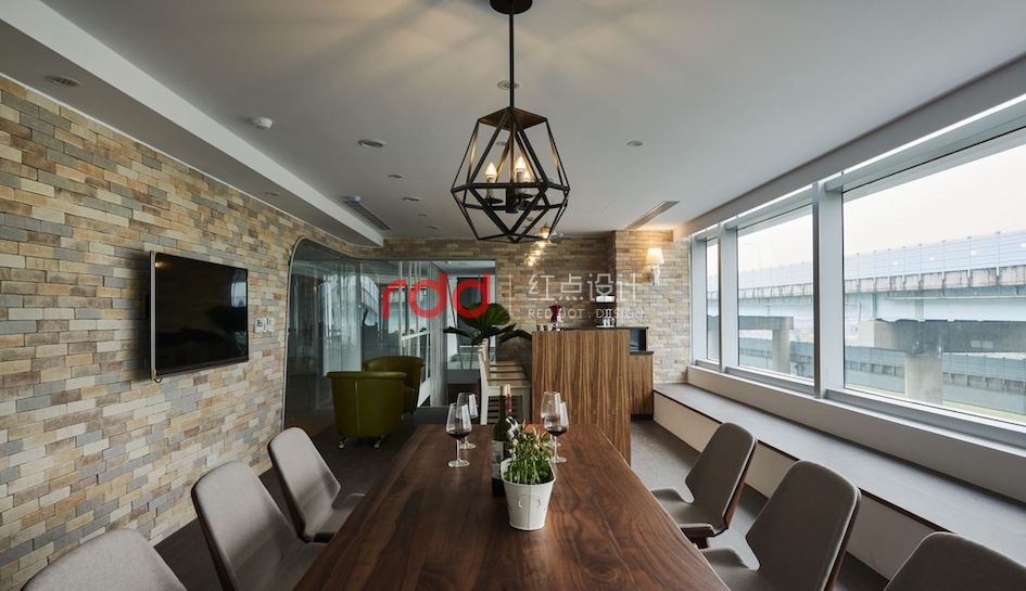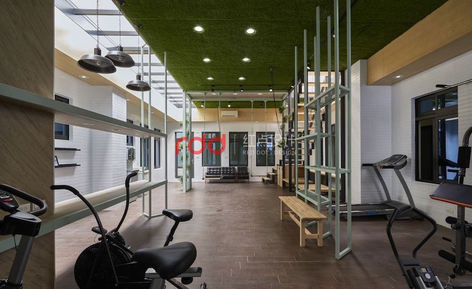 工作累了,還能和同事到咖啡館休息一下,咖啡館以暖色系文化石鋪排溫馨感,加上大面窗戶引進(jìn)柔和自然光,在這里喝杯咖啡,舒緩工作的緊張心情吧!特地為員工打造的健身室與休閑區(qū),不做滿的天花以玻璃罩保留采光,漆上蘋(píng)果綠的鐵件取代實(shí)體梁柱帶來(lái)輕盈感,視覺(jué)上也更加開(kāi)闊。除了擺上綠色盆栽,設(shè)計(jì)師讓綠意繼續(xù)蔓延,將草皮鋪到天花板上,增加空間中的生命感。