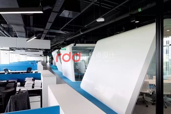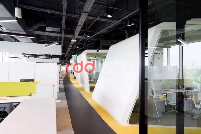 室內設計呼應阿迪達斯的標志,在每一層的同一個地方都有白色會議室,從中庭看,就能形成阿迪達斯的經典標志。