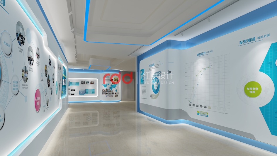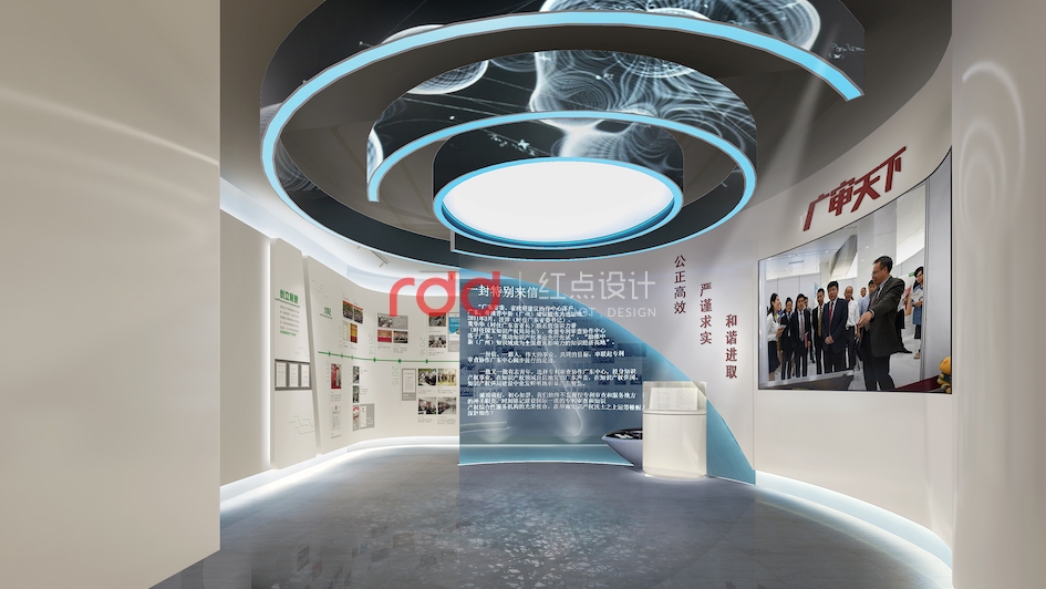 “百舸爭流奮楫著先,千帆競發勇進著勝?!笔钱斍爸R產權事業的發展狀態。根據這樣的發展趨勢,紅點裝飾的設計師按照客戶的需求,總結出本次展廳的新理念:開放包容、務實高效、公平公正。