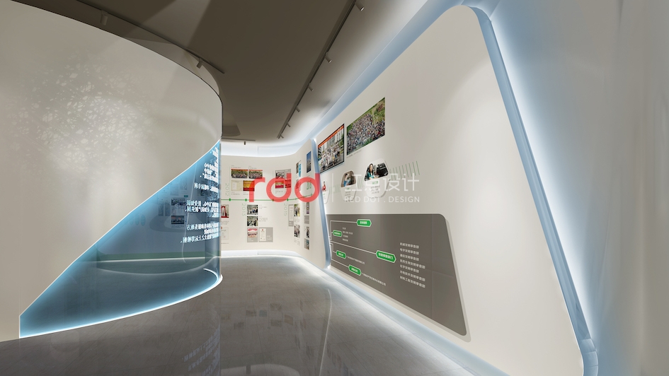 企業的發展前沿部分,墻面的弧形造型墻從地面一直延伸到天花,螺旋上升,綿延不斷,寓意著企業發展的前景、勢頭。