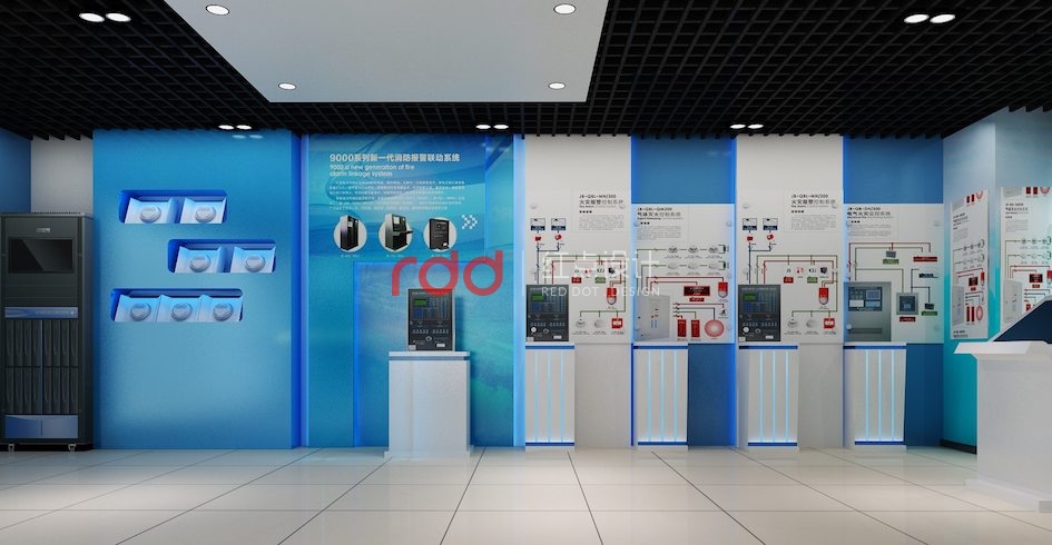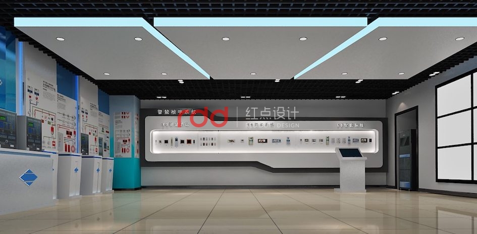 針對該公司從事的產(chǎn)品及業(yè)務(wù)情況,紅點(diǎn)裝飾的設(shè)計(jì)師,根據(jù)與客戶溝通后的情況,以藍(lán)色為主色調(diào),產(chǎn)品尺寸及參觀動(dòng)線設(shè)計(jì)展廳的參觀流程。
